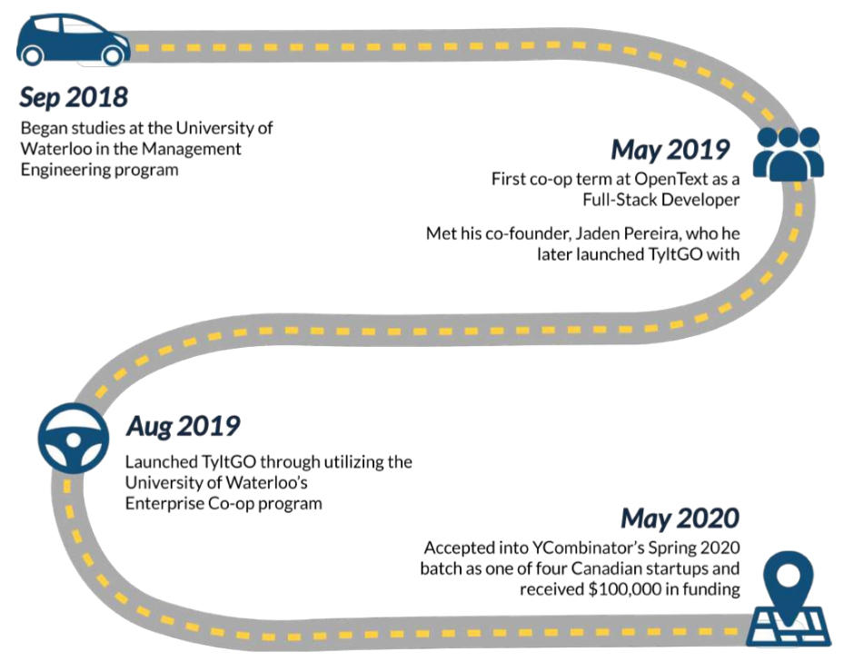 In fact, before his first E Co-op term, he began researching current market trends before even meeting his future partner, Jaden. Aaron immediately knew that Jaden was the person he wanted to start a company with as he was extremely serious and dedicated to the idea. Jaden had already spun up something on Shopify and that's what showed me his seriousness and dedication. They started TYLTGO in August of 2019, with hopes of changing and improving the delivery industry by targeting small businesses in the Kitchener/Waterloo corridor, now serving more businesses than before including retailers such as Walmart. Although it took immense willpower and courage for Aaron to leave school and pursue an entrepreneurial venture full-time, Aaron has been able to gain knowledge and experience from his business that would not have been possible through any other co-op employers. In hindsight, he believes that starting his own business was the best decision because of the opportunity it provided him to learn more about current market trends and meet others with similar visions. Throughout this process, he kept his initial mindset and, along with his co-founder Jaden, continued taking on risks such as applying and getting Y Combinator funding, which allowed the company to further expand into a more recognized name in the delivery industry.