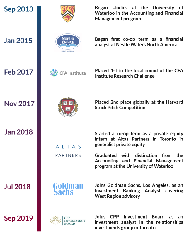 Upon identifying his passions and interests, Talha began to increase his extracurricular involvement by joining the Student Investment Fund, which solidified his plans to pursue finance upon graduation. He explains that the skills and knowledge he gained from his time on the Student Investment Fund translated directly to his co-op terms in finance and his full-time work now at CPPIB. In addition, the Student Investment Fund introduced him to Professor Ecclestone and Professor Jha, who also guided Talha on his path to becoming a finance professional. Further, the exposure to upper-year students on the fund helped Talha build his professional network and identify the different careers he could pursue within finance. Through networking with upper-year students and speaking to his professors, he recognized that pursuing investment banking full-time would be the best fit for him with regard to his goals and interests.