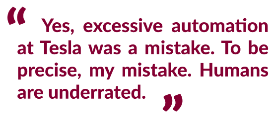 One large area of concern is Tesla’s methods of production, in particular its over reliance on automation. Since its early days, the company has leveraged the use of automation and advanced technologies- a primary factor of differentiation between itself and other automakers. Though ambitious, Tesla has suffered from over reliance on robots to automate not only the stamp, paint and welding processes but the entire final assembly which has inherently contributed to many of the challenges the production process faces today. Current and future Tesla Models are growing more and more complex- in such production processes, only humans can adapt to the rapid change and modifications sometimes necessary, something which has been neglected.