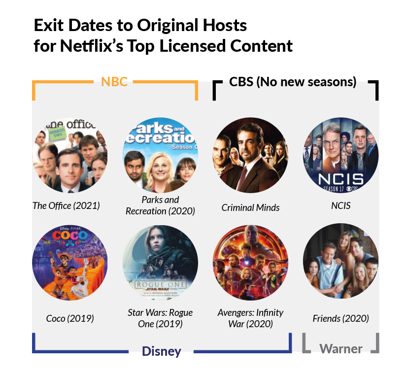 One of the key differentiators between streaming services and traditional cable television is the shows that they are able to offer. Cable TV offers bundled content, with specific packages containing restricted network content. On the other hand, streaming services have the ability to negotiate contracts for existing content while also offering their own original content, which in turn allows them to offer stronger breadth and quality of content that they offer as compared to traditional cable. This is what allowed Netflix to offer shows such as The Office, Friends, and an array of Disney movies in addition to their original shows. However, the classic content that was once featured on multiple streaming services is being pulled in order to be featured on new platforms created by the content’s owners. One of the most well known examples of this was when Disney removed their content from Netflix’s platform in order to create their own streaming service, Disney+.
