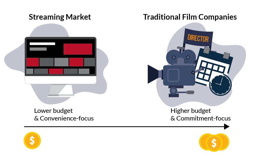 For example, films by independent studios such as Marvel’s Avengers: Endgame had a production budget of $356 million (Rubin, 2019), while Netflix's first film with a budget greater than $100 million was released in 2017. This demonstrates that the streaming market is taking over the lower and middle chunks of the film business and leaving the upper range alone (Fritz, 2018). The differentiating factor between tackling the middle market vs the upper end of the market is the logic and mindset that the studios use. Traditional film companies focus on commitment logic, whereas streaming services emphasize convenience logic. Convenience logic focuses on producing a broad range of content, which means that streaming platforms rely heavily on consumer data to produce a broad content library and present users with recommendations. In 2019 Netflix released 371 new, original shows and movies, which is more content then the entire U.S TV industry released in 2005 (Bridge, 2019).