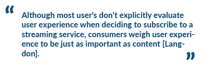 These tools and experiences fall under the concept of ‘user experience’. User experience describes all aspects of a user’s interaction with a product, which includes all of the possible user touch points from marketing and graphics to the service’s engineering and design (Norman & Nielsen). Most consumers don’t think about their experience when using a product unless it is frustrating or cumbersome, as their expectations are a flawless, pleasant experience. Although most user’s don’t explicitly evaluate user experience when deciding to subscribe to a streaming service, consumers weigh user experience to be just as important as content (Langston, 2019).