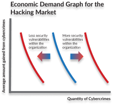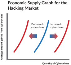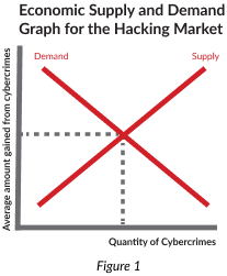 Opportunity cost is the cost of the next best alternative, which, in this case, would be the businesses’ indirect demand for hackers. Since prevention is costly, businesses typically tolerate some degree of hacking risks, and so this sensitivity can be perceived as an implicit "demand" for hacking. With the x-axis representing the number of cybercrimes (using an arbitrary quantity unit) and the y-axis representing the average amount gained from cybercrimes (again using an arbitrary price unit), the equilibrium occurs when the supply and demand curves intersect to represent the ideal hacking conditions because cyber crimes are inevitable. Pragmatically speaking, vulnerabilities, attacks, breaches, and malware are all part of the natural and expected order of things in information technology hacking and because cybercrimes cannot be completely eradicated, the onus is on businesses and organizations to employ both offensive and defensive tactics to protect their data.