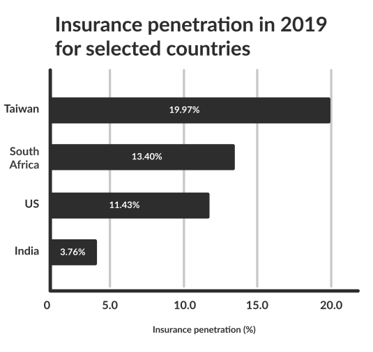 Crop insurance has existed in India for decades; however, it was overhauled in 2016 to make it more standardized. The principle behind crop insurance is simple: the insurer promises to pay up to a certain amount of money to compensate farmers for any damage to their crops from drought, and in return, farmers pay the insurance company a premium, which is usually set at a certain percentage of the assured amount. Currently, the premium rate paid by farmers ranges from 1.5% to 5%. However, the government subsidizes 80% of the total premium paid to insurance companies, meaning that the real premium Indian insurers receive is 7.5% to 25%. Insurance penetration in India, as of 2019, was only 3.76%, while the global average during the same time period was 7.23%, with the American figure being 11.43%.