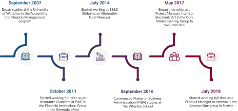 Early on, when beginning her post-secondary education at the University of Waterloo, Stephanie had a strong interest in accounting. This led her to the AFM program as it had a strong technical background which combined with co-op, would prepare students well for the world of accounting. Stephanie would go on to complete co-op placements at Mercedes in their accounting and audit department. After graduating from the MAcc program in 2011 and completing the Uniform Evaluation (UFE), she started her full-time career at PwC in their Bermuda office, where she had the opportunity to work as an Assurance Associate in the Financial Institutions group. Within a year, she was promoted to Senior Associate and stayed with the firm for 3 more years before ultimately leaving to join SS&C Corp as an Alternative Fund Manager.