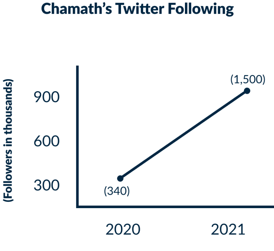 Recently, public perception of SPACs has been favourable, specifically because of access. Access to information, sponsors and opportunity. Social media, the democratization of investing, and access to markets have allowed retail investors to enter and better understand investment vehicles and opportunities that exist- which they wouldn’t have been able to in the past. Social media has been vital for both SPAC management teams as well as retail investors with platforms such as Twitter and Linkedin being among the most important social media channels for investor relation strategies. One person who’s amassed quite the following and who's SPAC deals have fared fairly well over the past year is Chamath. In less than a year, Chamath’s following on Twitter has increased 4-fold!